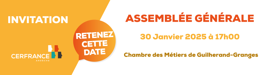 Le Conseil d'Administration de Cerfrance Ardèche a le plaisir de vous convier à notre Assemblée Générale, le jeudi 30 janvier 2025 à 17h00, à la Chambre des Métiers et de l'Artisanat de Guilherand-Granges.